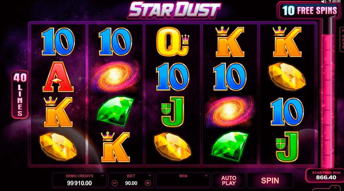 Výherní automat Startdust je ikonický stroj, který milují hráči po celém světě. Dokonce je možné, že se jedná o nejznámější a nejvíce hraný automat, který kdy spatřil světlo světa. U výherního automatu Stardust se můžete těšit na 5 válců a celkem 40 výherních řad. Tématicky je automat koncipován jako vesmírná loď, ve které letíte napříč šiřým vesmírem. Z toho plyne, že symboly které se vám budou na válcích ukazovat symboly jako jsou např. hvězdy. Ve hře je potřeba hlídat bonusové symboly, které vypadají například jako slovo „stardust“, ten vám dokáže nahradit výherní kombinaci u ostatních válců a tučná výhra je vaše.